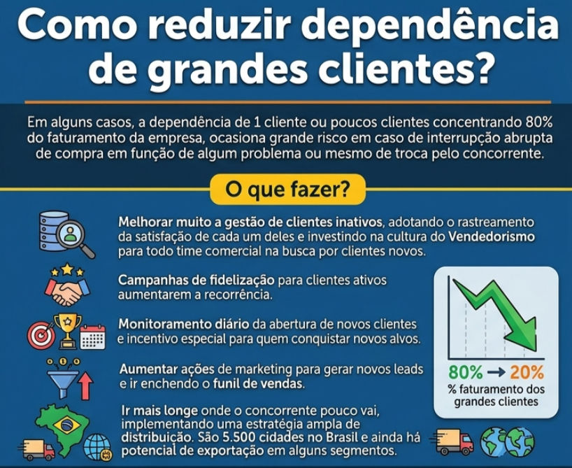 Em alguns casos, a dependência de 1 cliente ou poucos clientes concentrando 80% do faturamento da empresa, ocasiona grande risco em caso de interrupção abrupta de compra em função de algum problema ou mesmo de troca pelo concorrente.